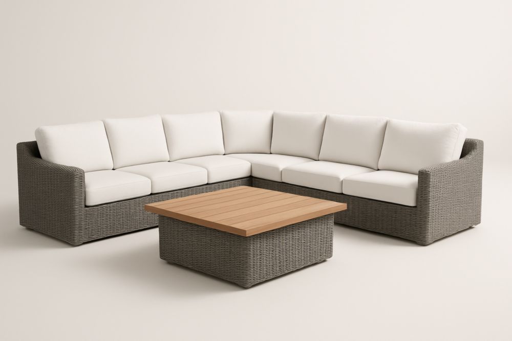Set angolare in rattan sintetico con tavolino in legno massello grigio e Ecru