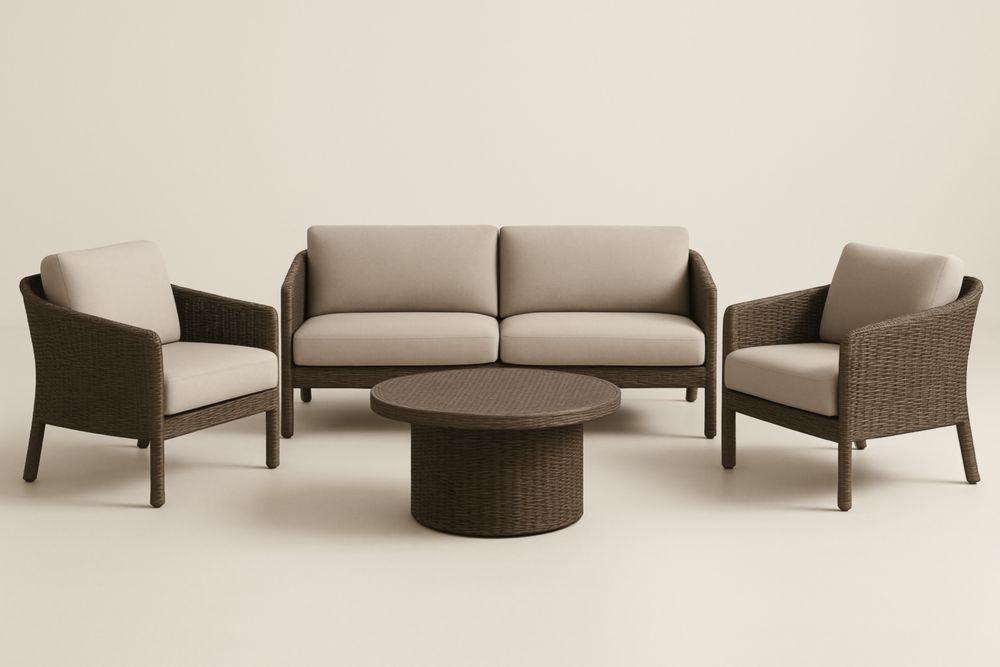 Set Divano da Esterno in Rattan con Due Poltrone e Tavolino Rotondo, Cuscini Inclusi