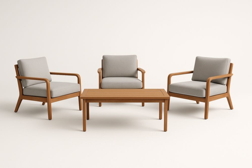 Set divano da giardino in legno di teak con cuscini in tessuto poliestere grigio